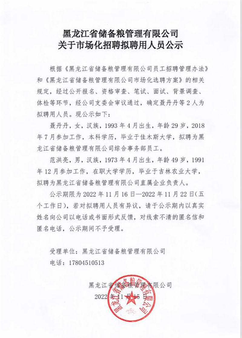 黑龍江省儲(chǔ)備糧管理有限公司關(guān)于市場(chǎng)化招聘擬聘用人員公示