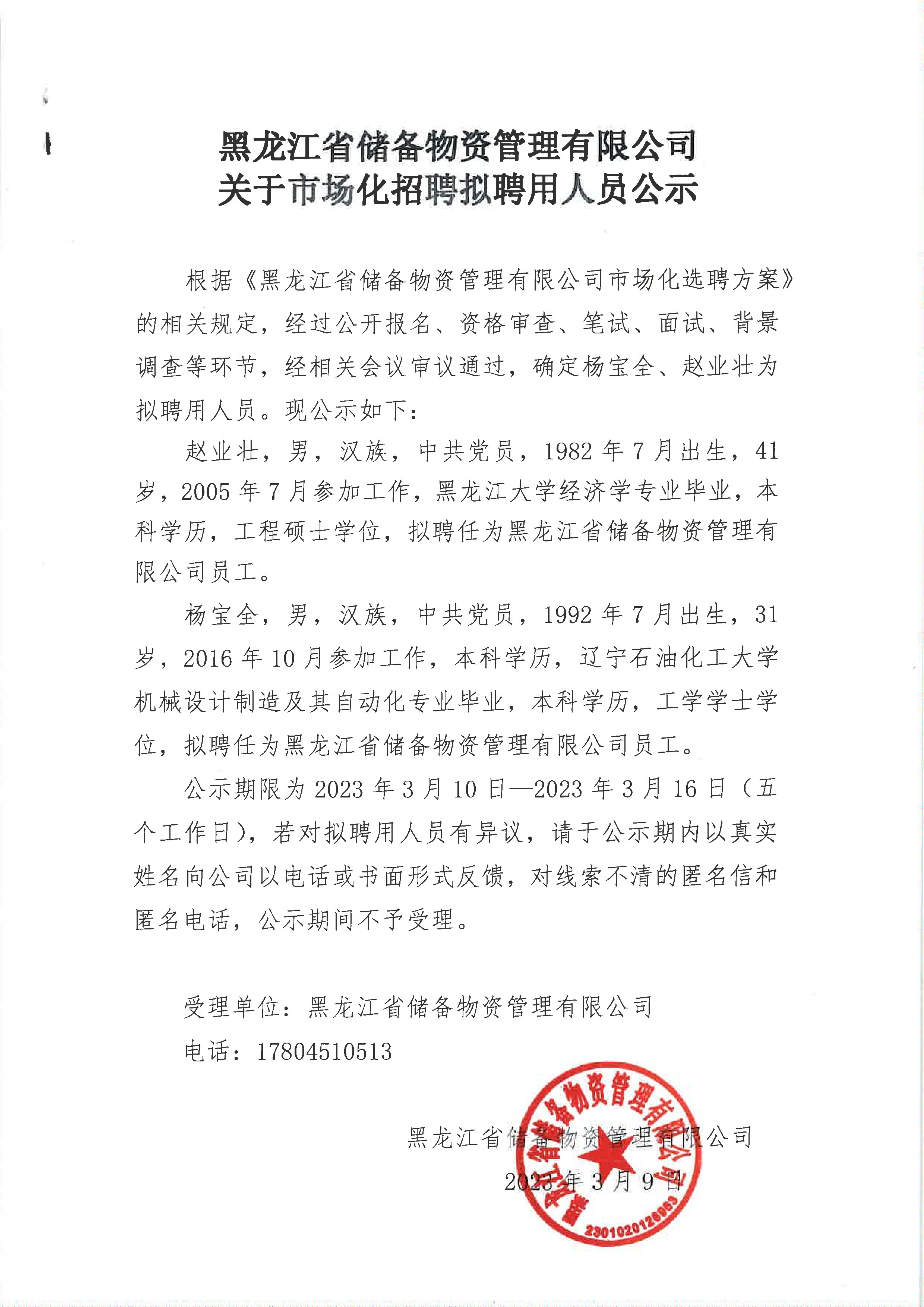 黑龍江省儲(chǔ)備物資管理有限公司關(guān)于市場(chǎng)化招聘擬聘用人員公示