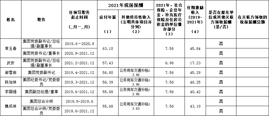 關(guān)于企業(yè)負責人2021年度薪酬和2019-2021年任期激勵信息披露的公告