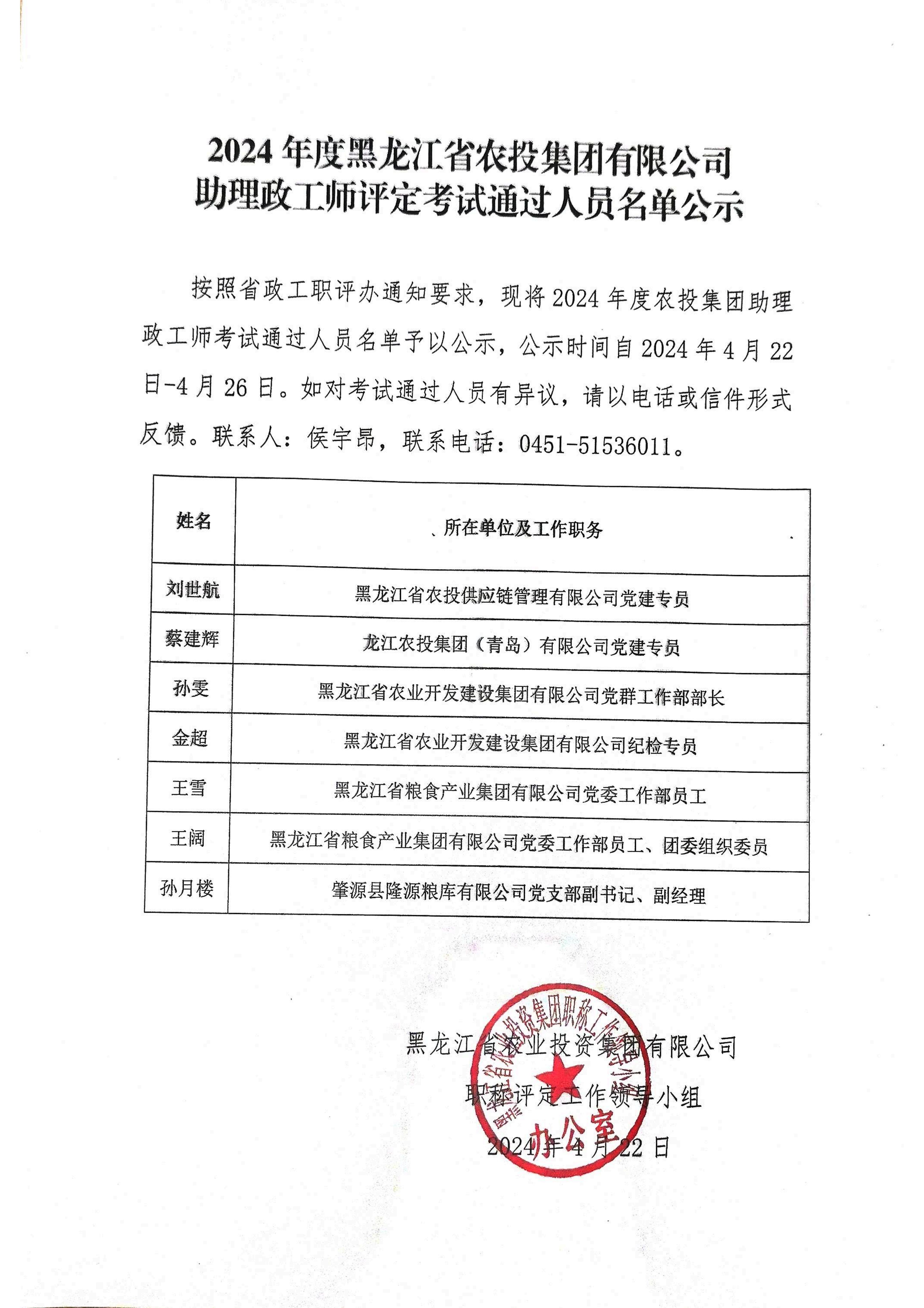2024年度黑龍江省農(nóng)投集團(tuán)有限公司助理政工師評(píng)定考試通過人員名單公示