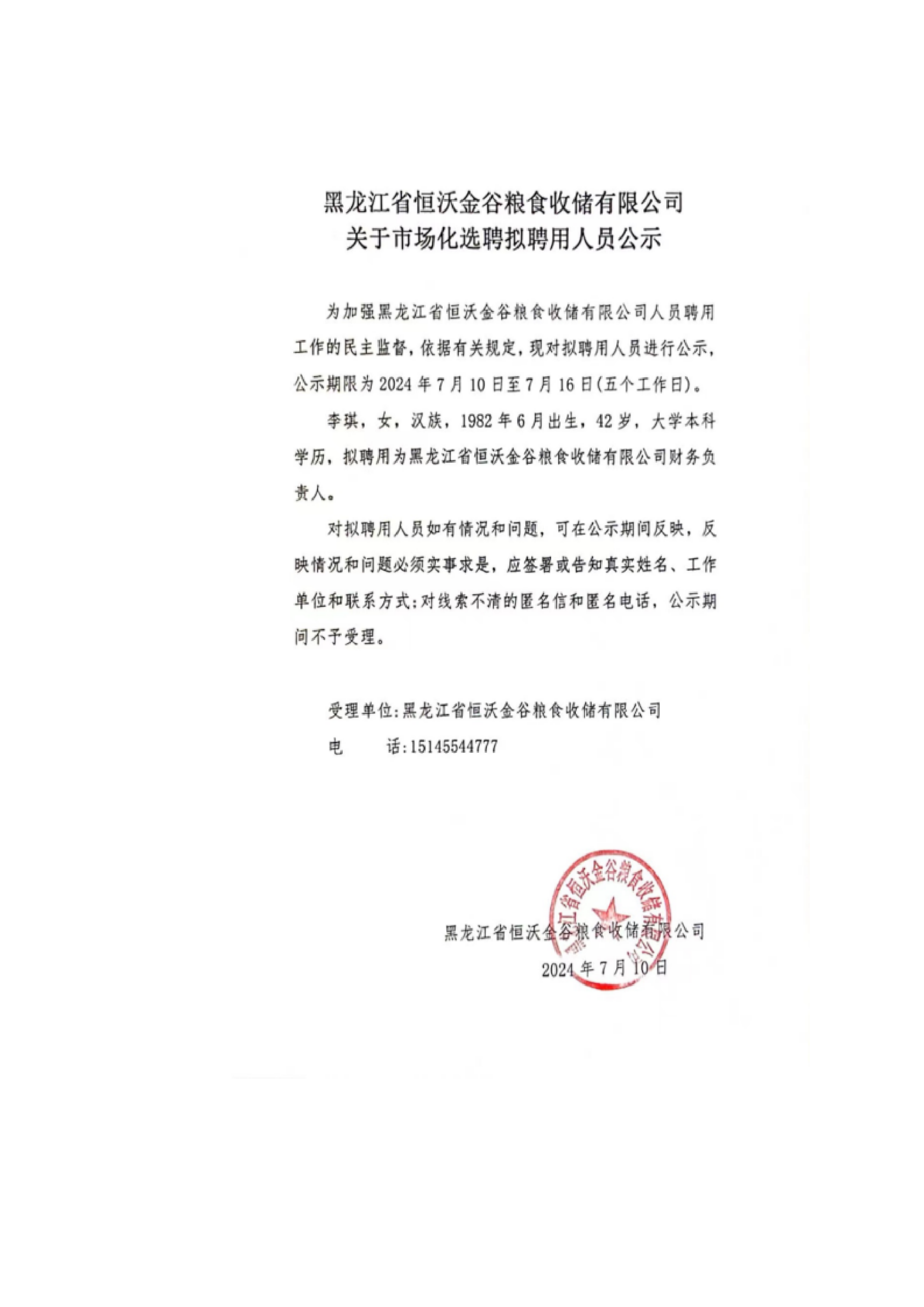 黑龍江省恒沃金谷糧食收儲(chǔ)有限公司 關(guān)于市場(chǎng)化選聘擬聘用人員公示