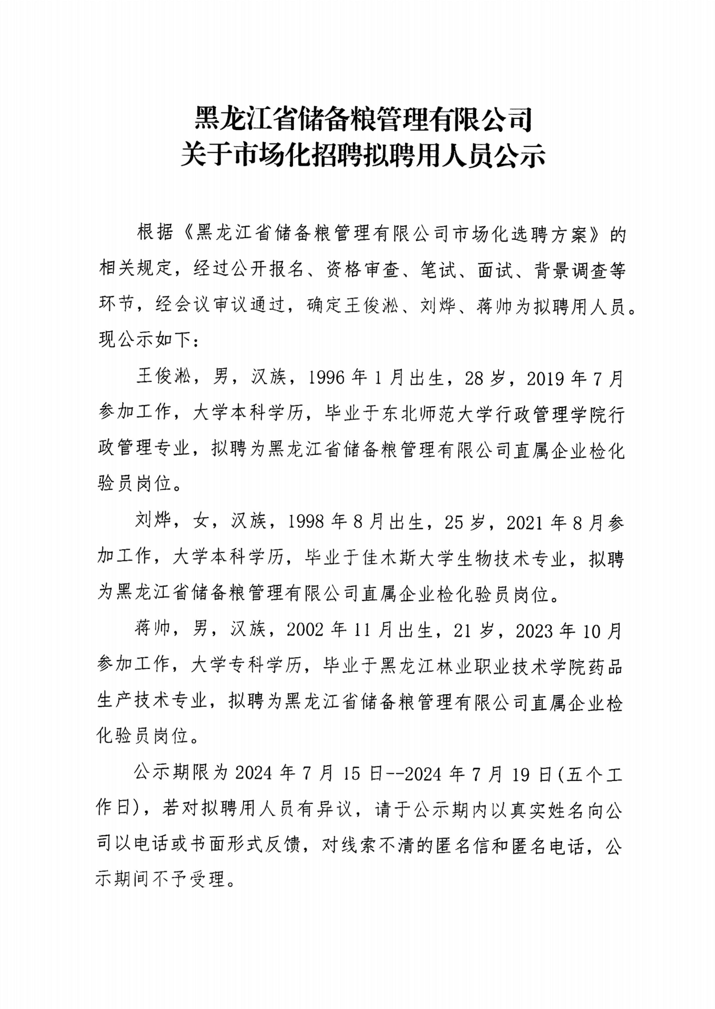 黑龍江省儲(chǔ)備糧管理有限公司關(guān)于市場(chǎng)化招聘擬聘用人員公示