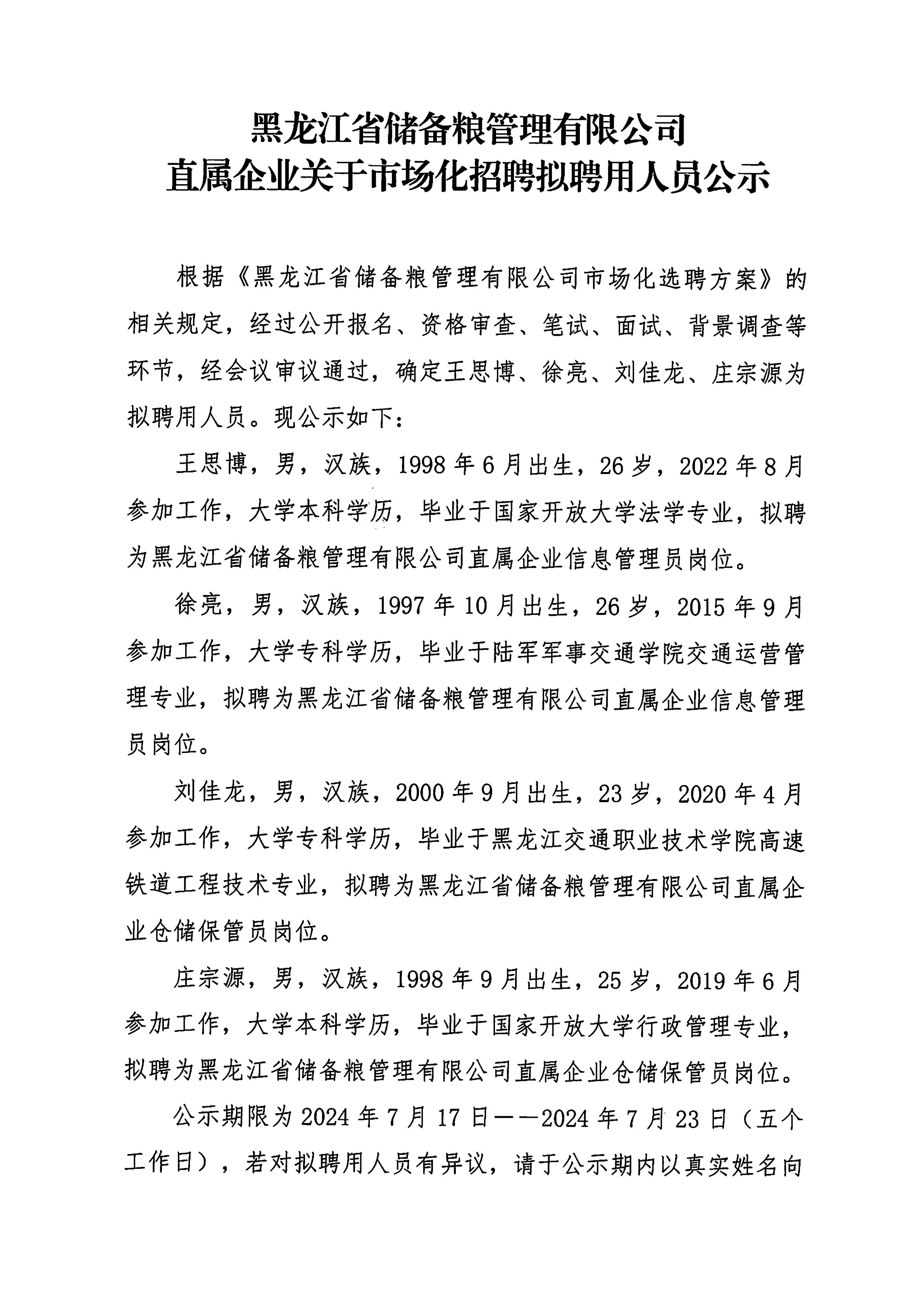 黑龍江省儲(chǔ)備糧管理有限公司直屬企業(yè)關(guān)于市場(chǎng)化招聘擬聘用人員公示