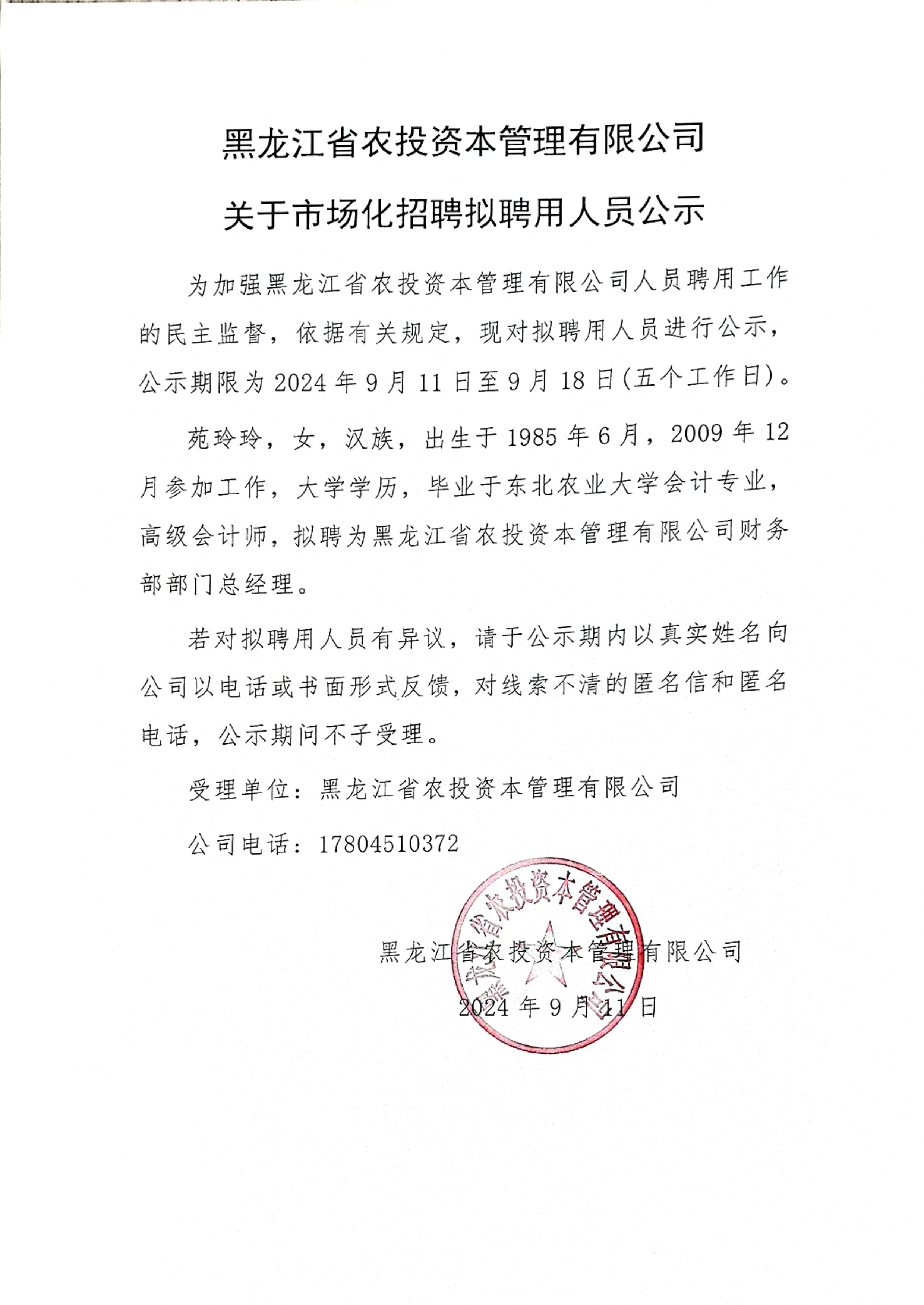 黑龍江省農(nóng)投資本管理有限公司關(guān)于市場(chǎng)化招聘擬聘用人員公示