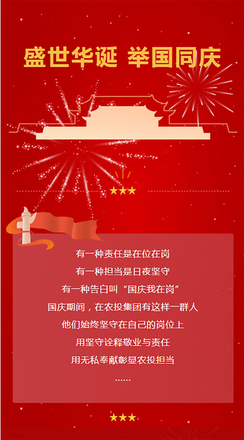 值此中華人民共和國成立75周年之際,樺川縣鴻吉糧食貿(mào)易有限公司全體員工深感榮幸和驕傲,全體員工向偉大的祖國獻(xiàn)上最誠摯的祝福。衷心祝愿祖國母親繁榮昌盛、國泰民安,祝愿祖國的明天更加美好。未來,我們將繼續(xù)發(fā)揚(yáng)“團(tuán)結(jié)、拼搏、創(chuàng)新、務(wù)實(shí)”的企業(yè)精神,不斷拓展業(yè)務(wù)領(lǐng)域,提高企業(yè)核心競爭力,在龍糧集團(tuán)的領(lǐng)導(dǎo)下,為實(shí)現(xiàn)中華民族偉大復(fù)興的中國夢貢獻(xiàn)智慧和力量。