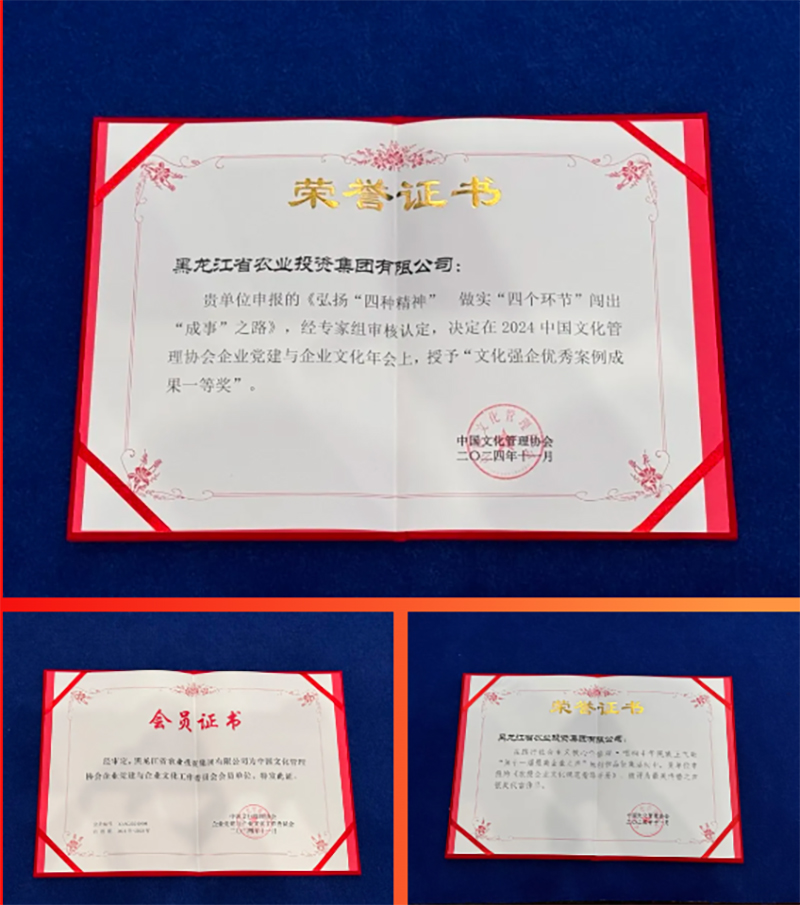 為貫徹黨的二十屆三中全會精神,進一步推進新時期企業(yè)黨建、文化建設(shè)深入有效開展,11月12日-14日,2024中國文化管理協(xié)會企業(yè)黨建與企業(yè)文化年會在杭州召開。會上,發(fā)布企業(yè)黨建與企業(yè)文化系列實踐創(chuàng)新成果,舉辦“第十一屆”最美企業(yè)之聲展播活動。由黑龍江省農(nóng)業(yè)投資集團有限公司(以下簡稱農(nóng)投集團)選送的《弘揚“四種精神” 做實“四個環(huán)節(jié)” 闖出“成事”之路》榮獲文化強企優(yōu)秀案例成果一等獎,《農(nóng)投企業(yè)文化規(guī)范指導(dǎo)手冊》被評為“最美傳播之聲”銀獎代言作品。