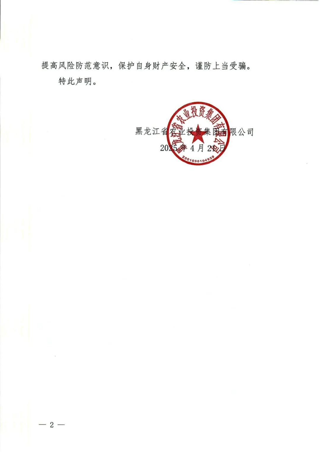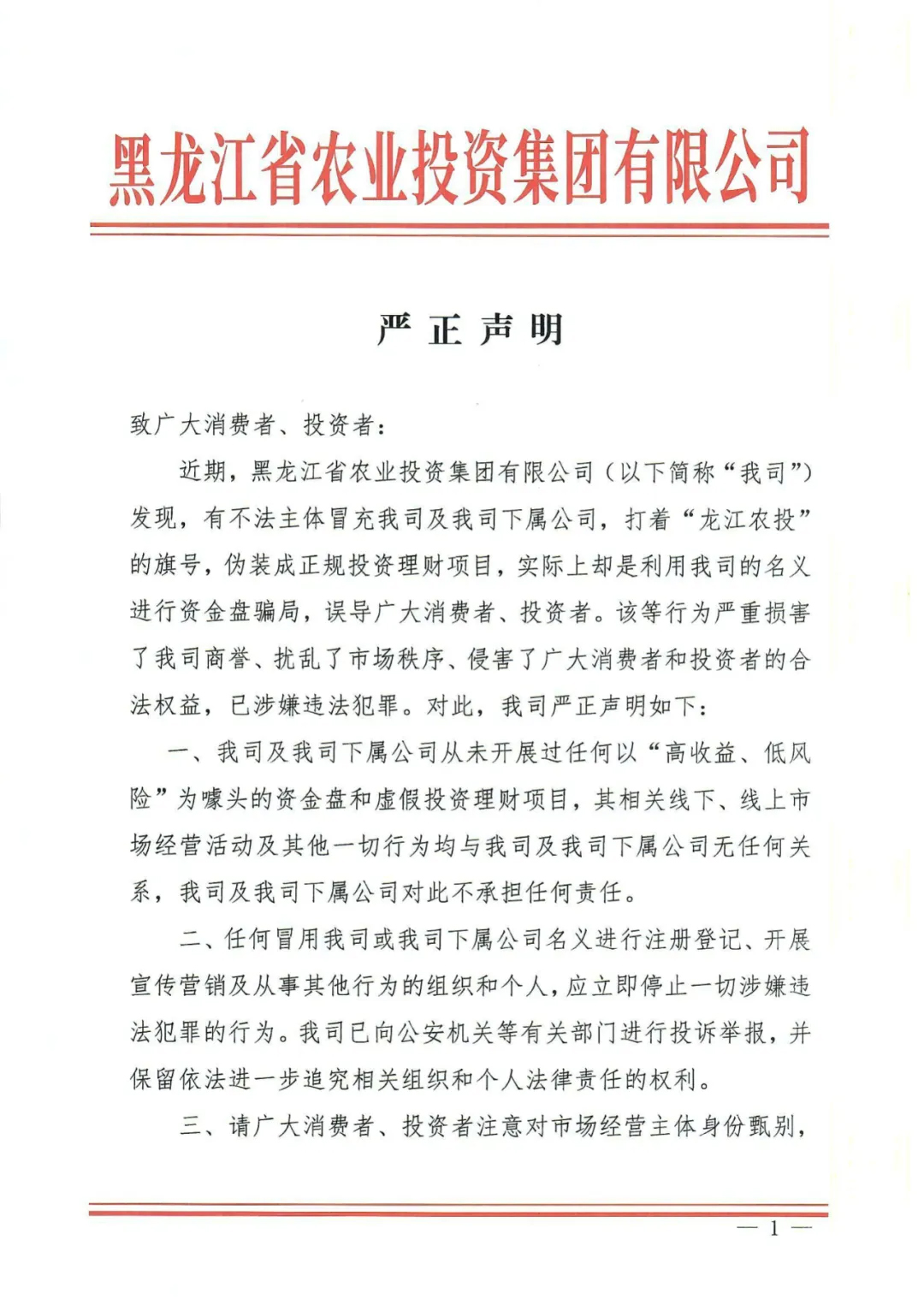 黑龍江省農(nóng)投集團(tuán)嚴(yán)正聲明