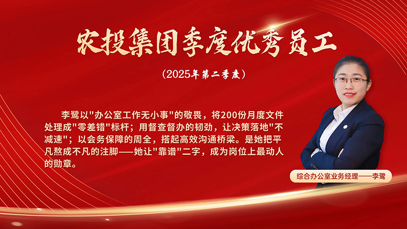 為表彰先進(jìn),樹立典型,有效激發(fā)農(nóng)投集團(tuán)總部全體員工的工作熱情、主動(dòng)性和創(chuàng)造力,農(nóng)投集團(tuán)總部對(duì)季度優(yōu)秀部門和優(yōu)秀員工開展評(píng)選工作。集團(tuán)黨委組織部(人力資源部)被評(píng)為集團(tuán)總部2025年第二季度“優(yōu)秀部門”、綜合辦公室(黨委辦公室、董事會(huì)辦公室、總經(jīng)理辦公室)業(yè)務(wù)經(jīng)理李鷺被評(píng)為集團(tuán)總部2025年第二季度“優(yōu)秀員工”。